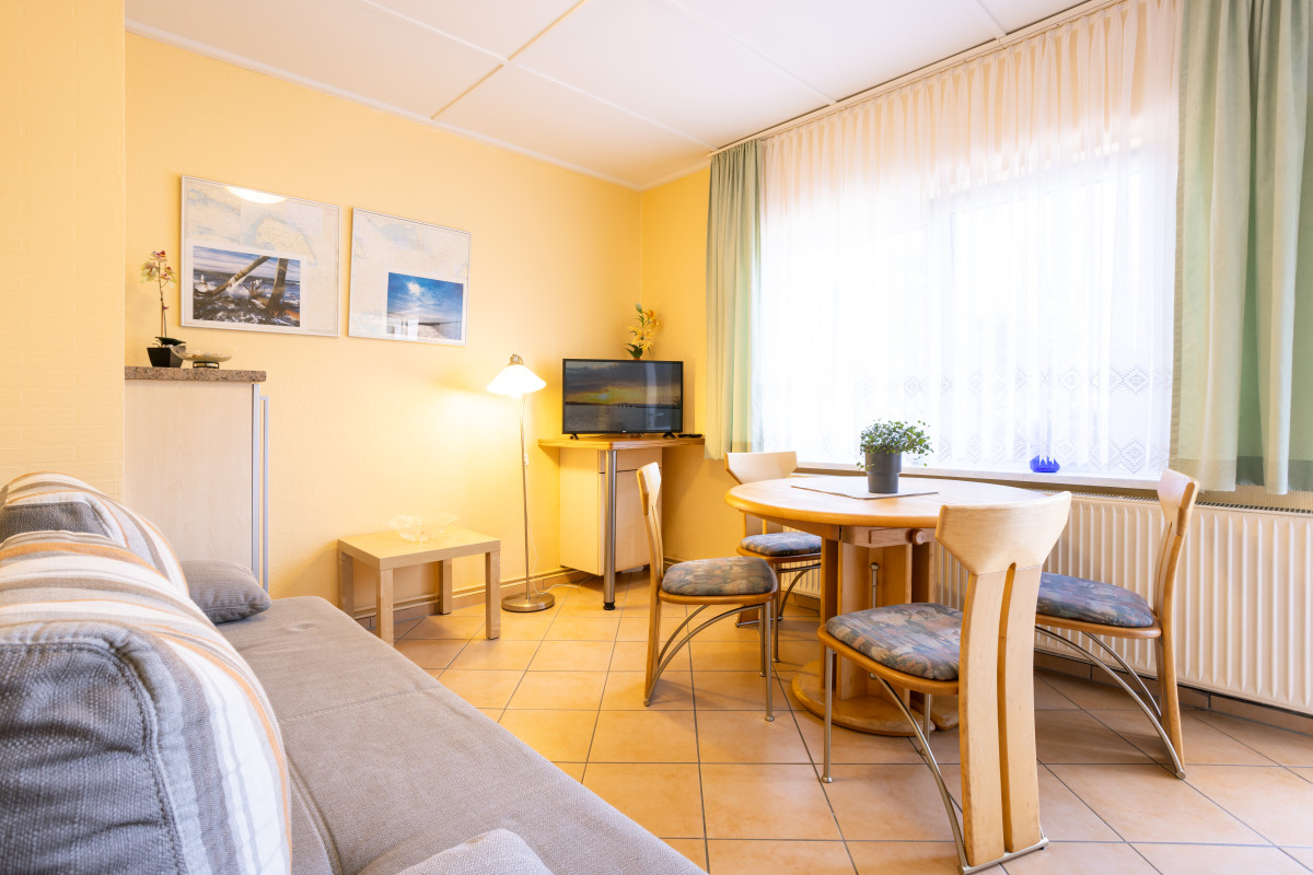 Jede Ferienwohnung verfügt über einen hellen Wohnbereich mit praktischer Kochnische, die mit allem Nötigen für Ihren Aufenthalt ausgestattet ist. Ob Frühstück auf der Terrasse oder ein entspanntes Abendessen – hier lässt sich der Urlaub ganz individuell genießen.